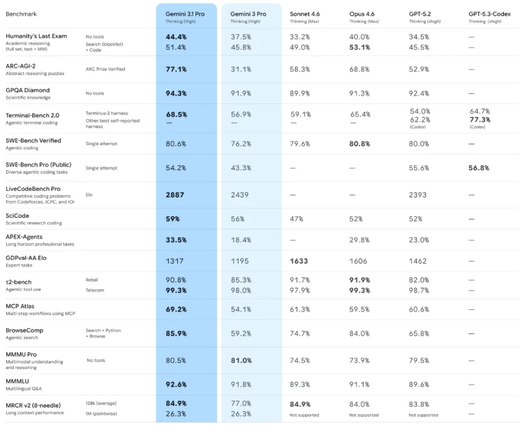 According to official benchmark data, Gemini 3.1 Pro recorded a score of 77.1%, which represents a twofold increase in performance compared to Gemini 3 Pro. This indicates a substantial advancement in deductive accuracy when encountering unfamiliar logical tasks. Furthermore, Gemini 3.1 Pro’s reasoning capabilities show a nearly 20% improvement over the recently released Claude Sonnet 4.6.