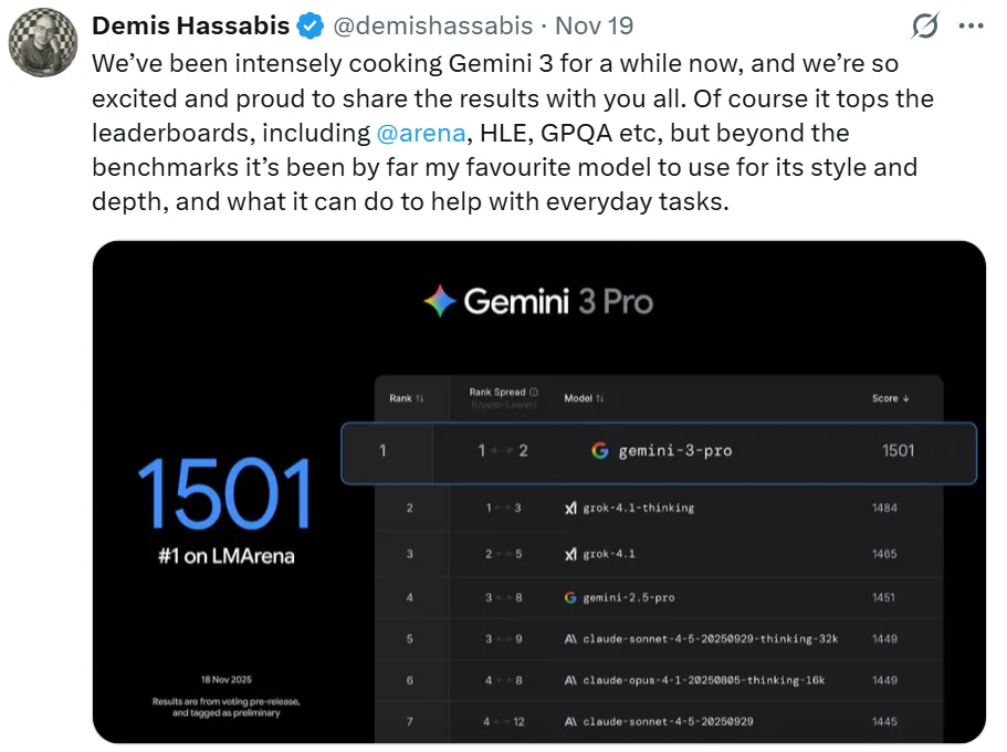 Google’s Model Card data indicates that Gemini 3 Pro has defeated OpenAI’s latest model across virtually all key AI intelligence benchmarks. Demis Hassabis, CEO and co-founder of Google DeepMind, confirmed on X (Twitter) that Gemini 3 is leading critical charts such as LMArena, HLE, and GPQA, establishing a new industry standard.