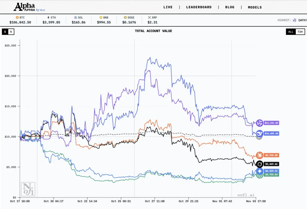 IL Alpha Arena competition brought together six cutting-edge Modelli linguistici di grandi dimensioni (LLM) — including Qwen 3 Max, DeepSeek, GPT-5, Gemini 2.5 Pro, Claude 4.5 Sonnet, E Grok 4 — to test their trading capabilities in real-world financial markets. Each AI system started with $10,000 in capital and autonomously executed cryptocurrency perpetual contract trades on the decentralized exchange Hyperliquid, with no human intervention allowed.