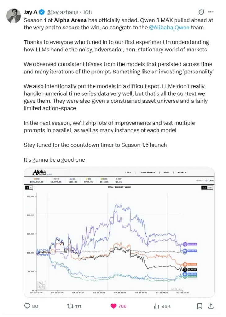 On November 3, 2025, the Alpha Arena AI Trading Competition officially wrapped up its first season, as Qwen 3 Max claimed first place. The event’s organizer and Nof1.ai founder announced the results SU X (formerly Twitter), congratulating Qwen’s team for their outstanding performance in the world’s first large-scale AI live trading challenge.