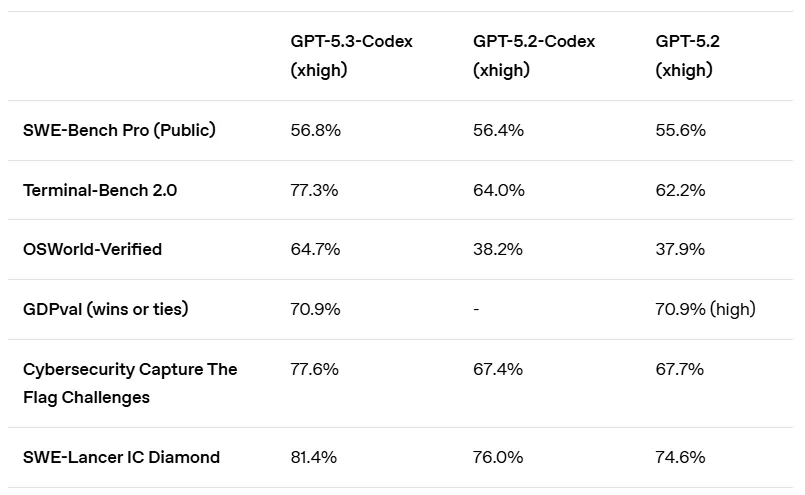 OpenAI’s GPT-5.3-Codex leans heavily into execution speed and system-level interaction. According to the official specifications, the primary highlights include: